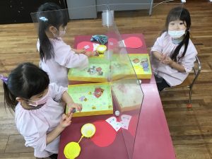 今日はすもう大会に向けての練習を行ない、その後に折り紙制作の続き作業を行なっていました。だるまに表情を描き入れたり、手足を貼り付けて可愛らしい作品が出来上がった様ですよ♪