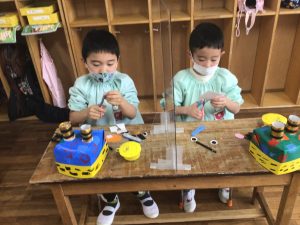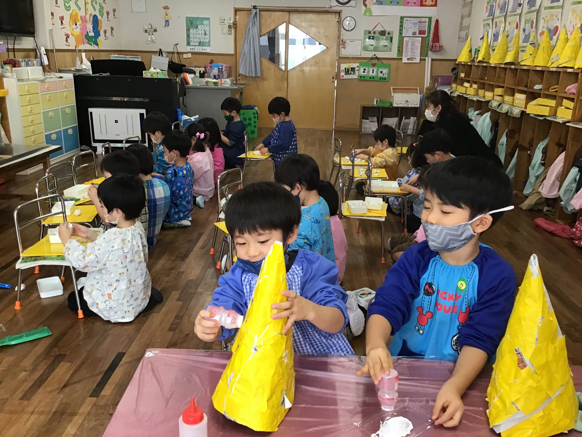 今日は顔にパーツを貼り付けていき、角にも模様を貼り付けていく作業を行なっていました。早く作業が終わったらホールに遊びに行こう!と話していたおかげで、張り切って取り組む姿が見られていた様ですよ♪