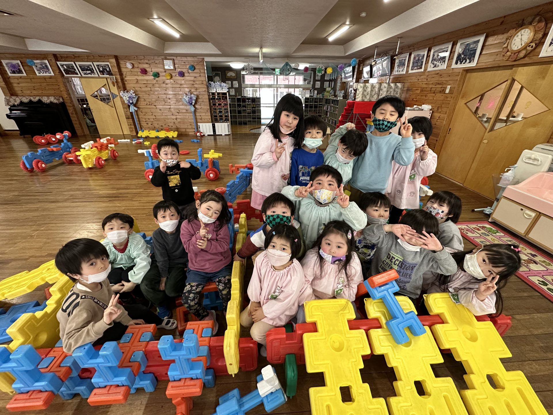 今日はホールで大型遊具を使いながら遊んでいました。車を組み立ててみたり、お家を組み立ててみんなで遊んだり、元気いっぱいに遊ぶ姿がみられていましたよ♪またみんなで楽しむ時間を作っていこうね!