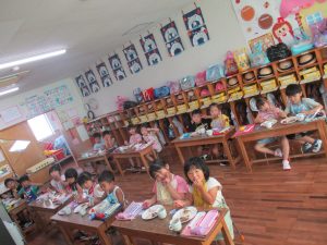 ★スイミング教室★2020.09.09全体 今日は年長組さんがスイミング教室に出掛けてきました。 今年度はこれが最後のスイミング教室という事で、子どもたちも楽しそうに参加していましたよ♪ 水に入って、潜ってと終始ニコニコでした! その他のクラスもゲーム遊びをしたり、お勉強をしてみたりと元気に過ごす事ができた様です。 今日はお給食の様子を撮影しましたよ♪トマトが今日のサラダには付いていたのですが、みんな頑張って食べていました。とても偉かったです!