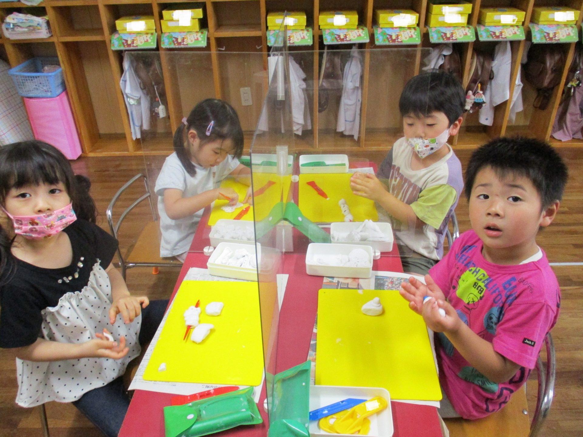 今日は粘土遊びを行なっていました。粘土で様々な食べ物を作って、段ボールで作られたバーベキューコンロの上で、順番に焼いていく活動でした。