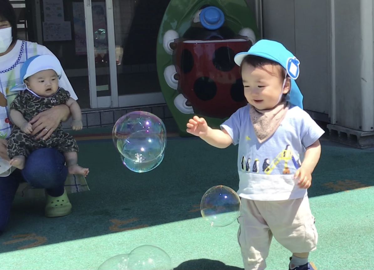 0歳児さんも一緒にお外に出て、とってもご機嫌さんでシャボン玉&シャボン玉を楽しむお兄ちゃんを眺めていましたよ!