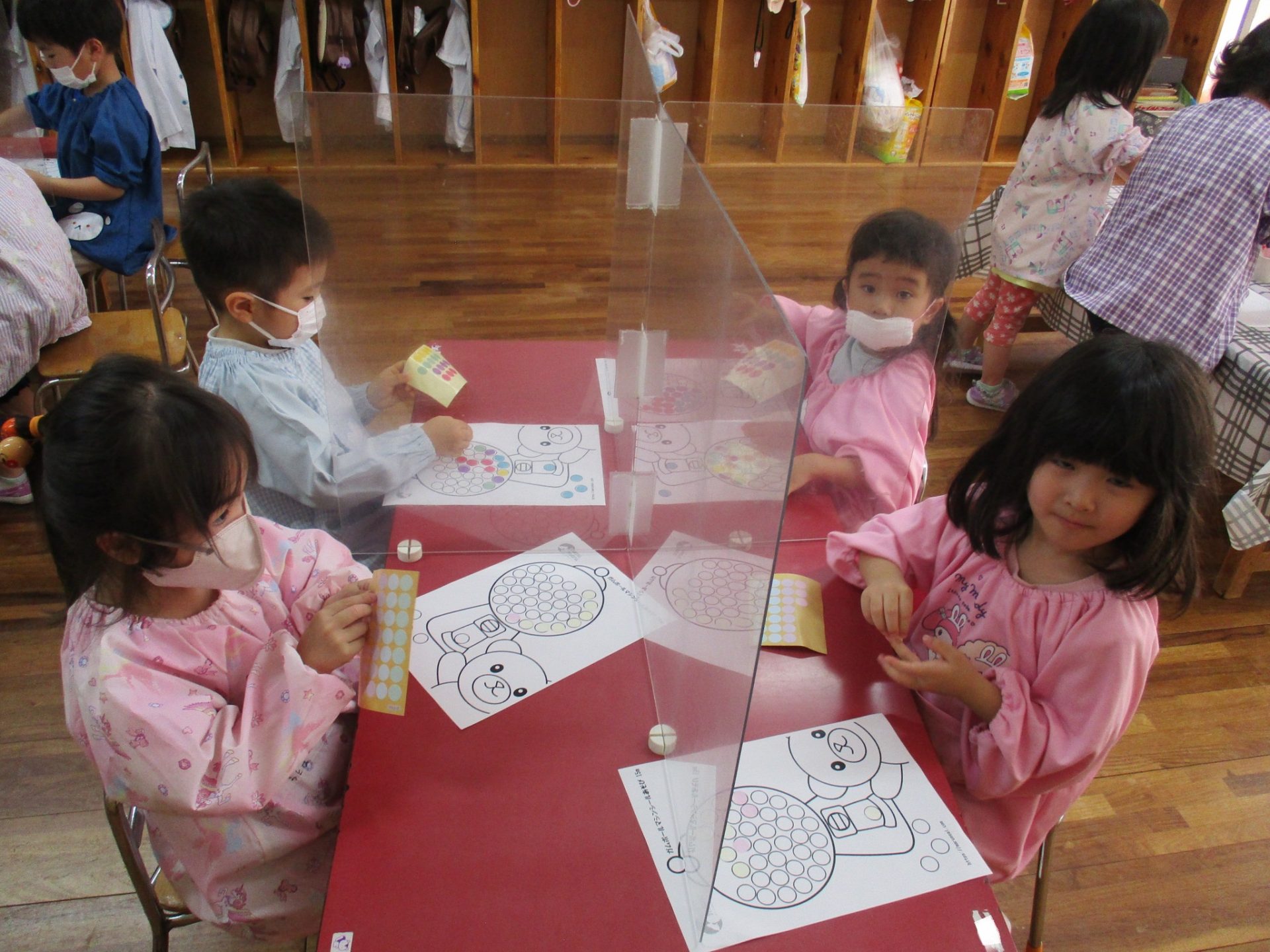 今日は黒色の絵の具を使って、緑画用紙に線を描いていき『スイカ』の模様を描いていました。待っている間はシールを使った活動をしていて、楽しく順番を待っている事ができたようですね♪