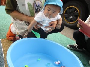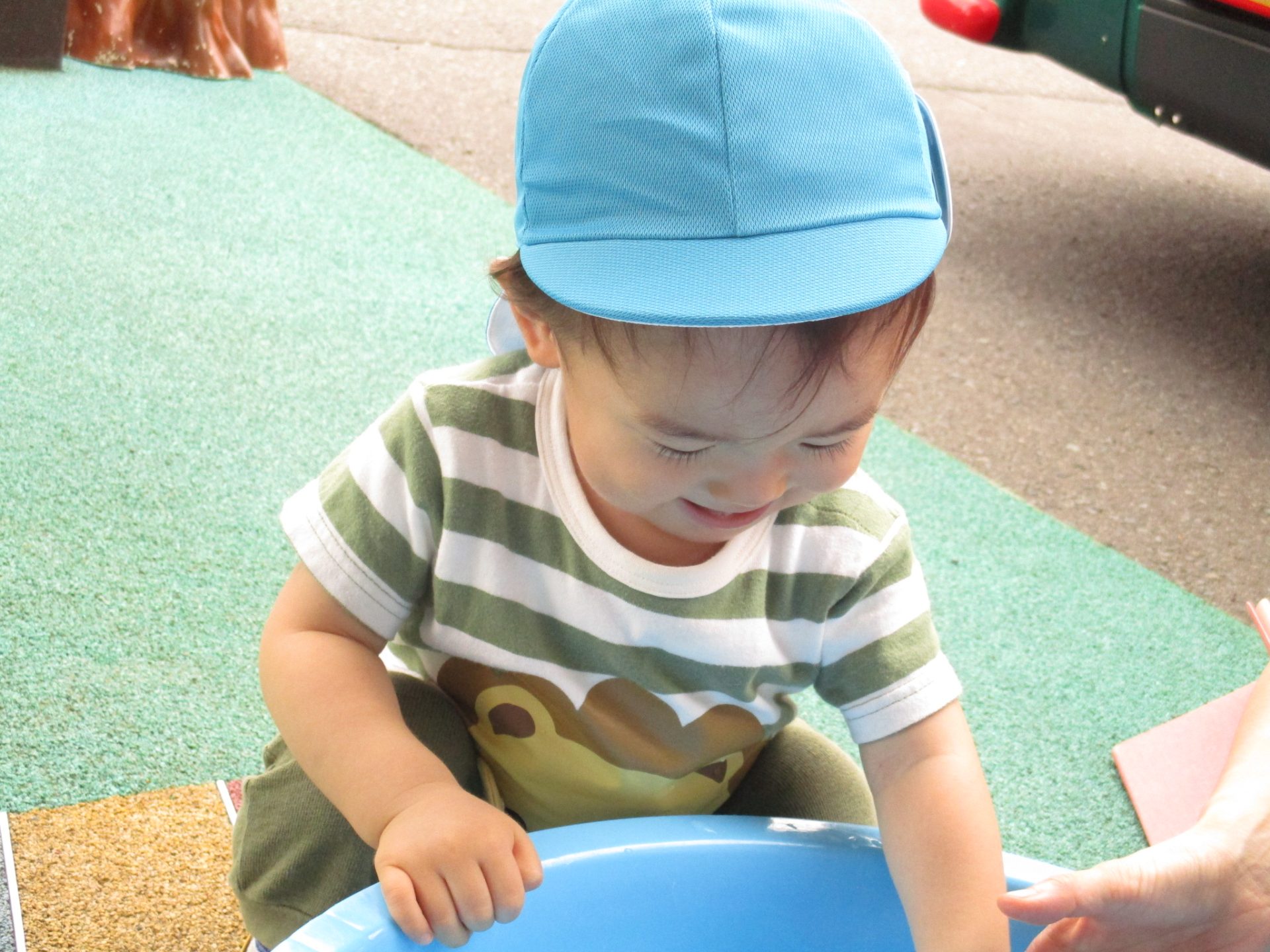 タライに水が溜まっていく様子を「あっ!あっ!」と指を差して、水に浮かべた魚やオモチャを楽しそうに追い掛けていました☆