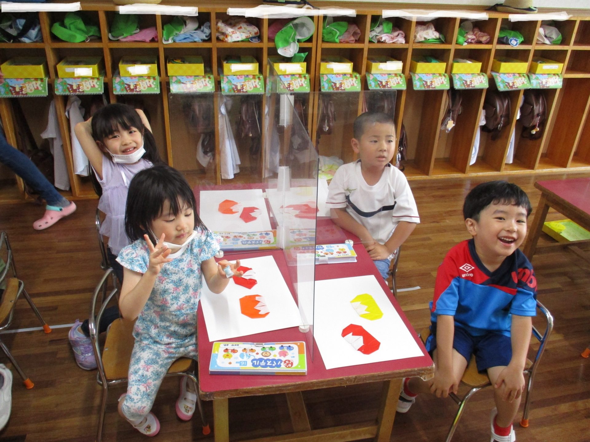 今月は『夏野菜』をテーマに製作を行なっていて、折り紙で作ったトマトの周りにキュウリやナス等、様々な夏野菜の仲間を描いて楽しんでいましたよ♪