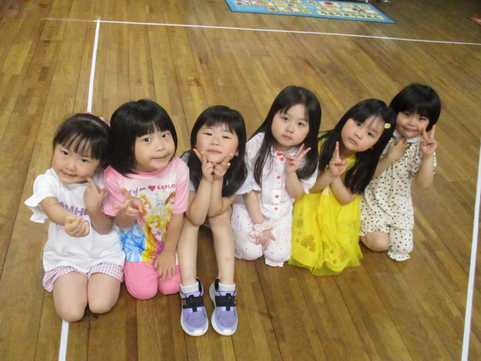 お部屋に1度集合をして、担任の先生から話があり、男の子はホール、女の子はつぼみ組の部屋を借りて、まずはパジャマにお着替えです♪
