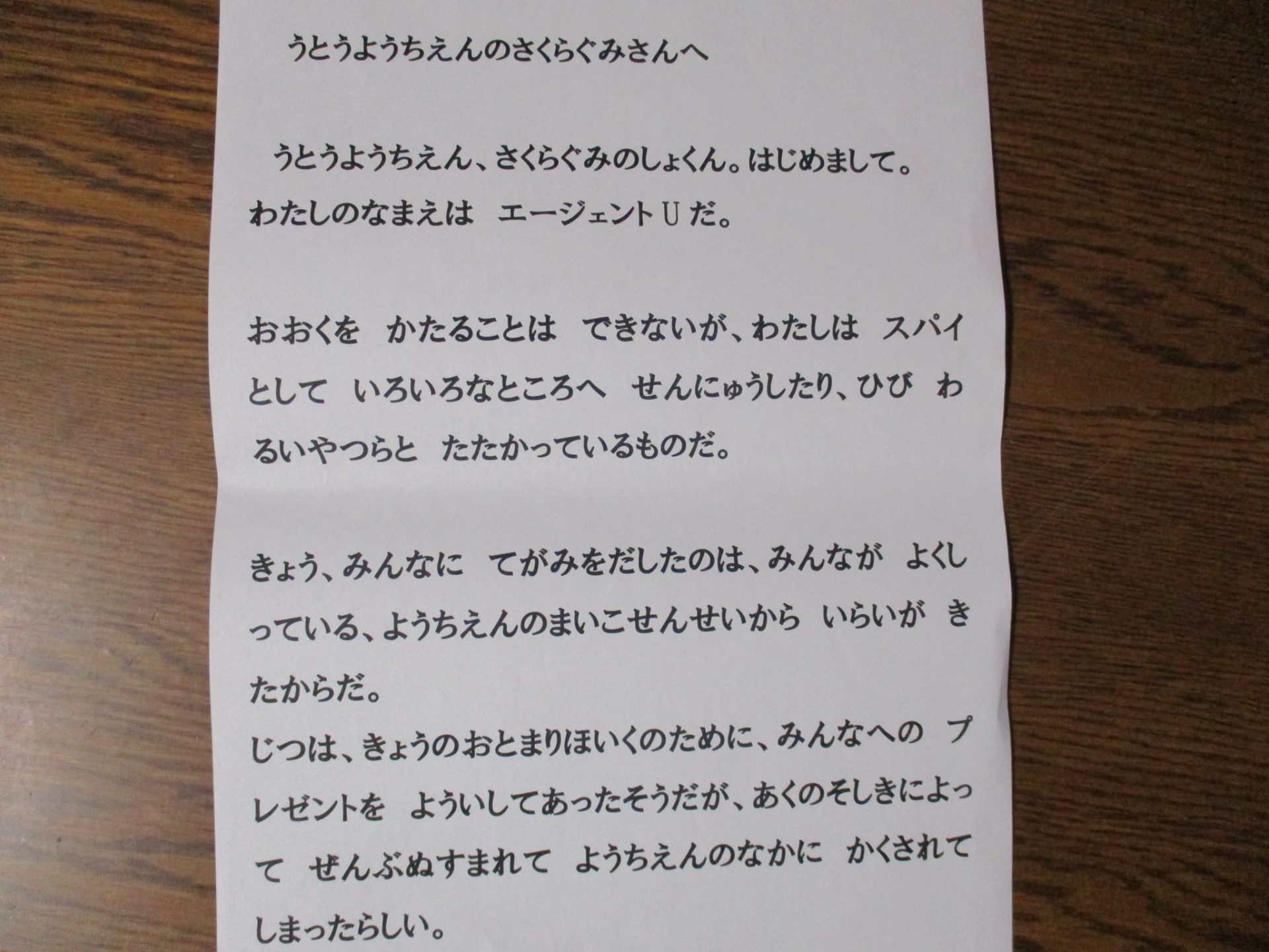 お泊まり会でのお約束事を確認していると何やら玄関ポストにお手紙が届いていたようで、先生がポストを覗いてみてみると、さくら組のみんなに向けたお手紙が入っていました。
