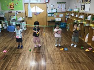 今日はお部屋にすずらんテープを貼りめぐらせて、そこにお人形の洋服を洗濯バサミで止めていき、『洗濯ごっこ』を楽しんでいました。みんなニコニコでママの真似をしながら干していましたよ♫