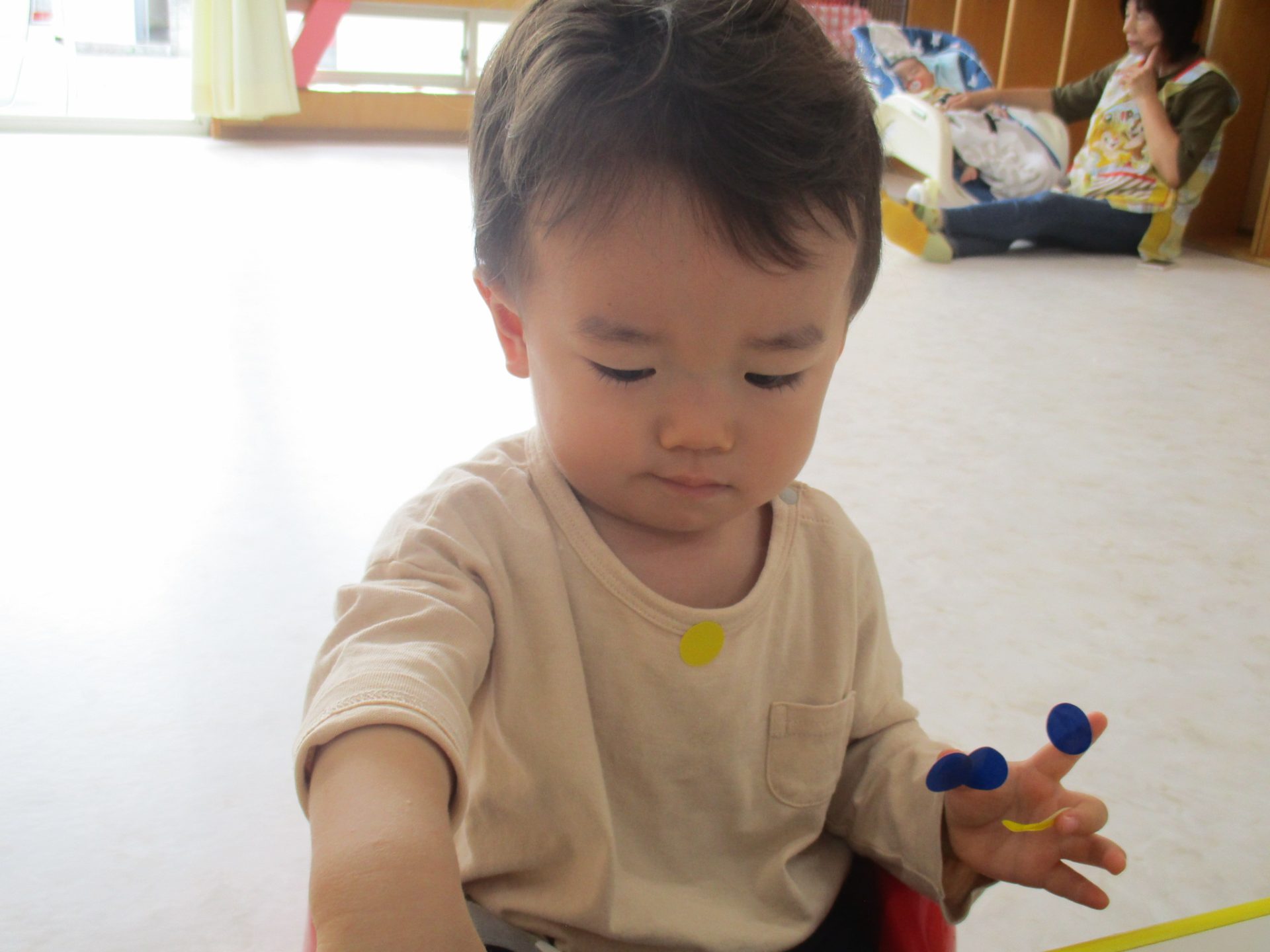 今日はシールを使った活動に取り組んでいました。手をシールだらけにしながらも満足げな表情を見せていましたよ(笑)
