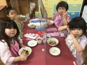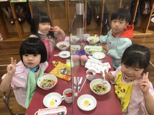 今日はみんなに大人気のラーメン!美味しそうな表情で食べていましたよ♪デザートのヨーグルトもニコニコで食べる姿があって、良かったです♪