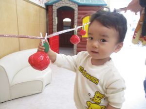 今日はお部屋で『リンゴ狩り』を行なっていました。お部屋にすずらんテープを貼り、リンゴを洗濯バサミで挟んでおきました。指先に力を入れて上手に洗濯バサミをパチン!と動かしてリンゴを収穫していましたよ♫