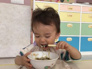 今日はカルタを行なっていました。まだ平仮名はうまく読めない子が多いので、わかりやすい『食べ物』をテーマにしたカードを使っていく事で、絵柄を頼りにしながら楽しそうに取り組んでいましたよ♪