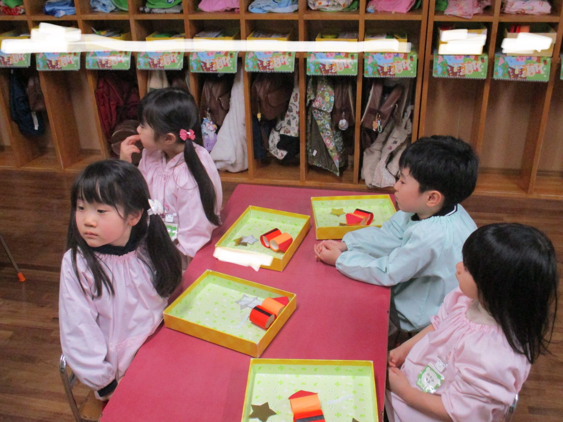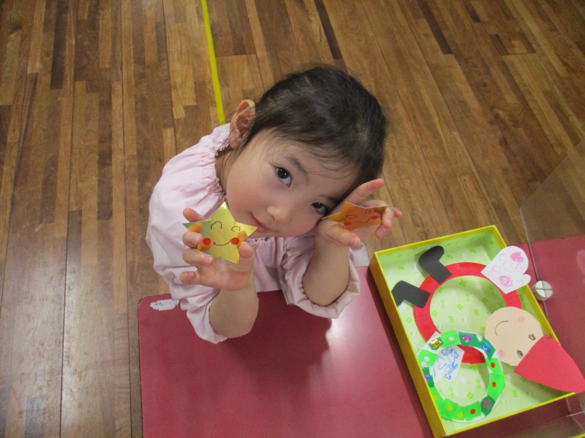 工作用紙を星形に切った物にペンとシールを使って表情を描き加えていましたよ!