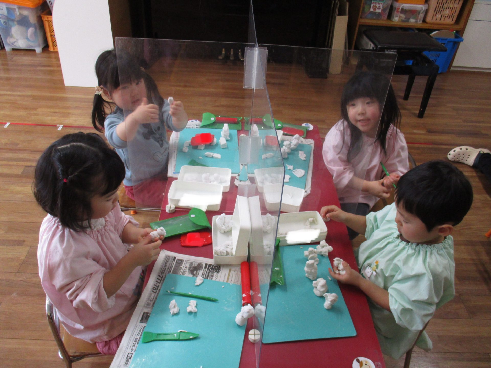 今日は『冬休みの思い出』をテーマに粘土遊びを行なっていました。