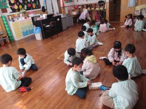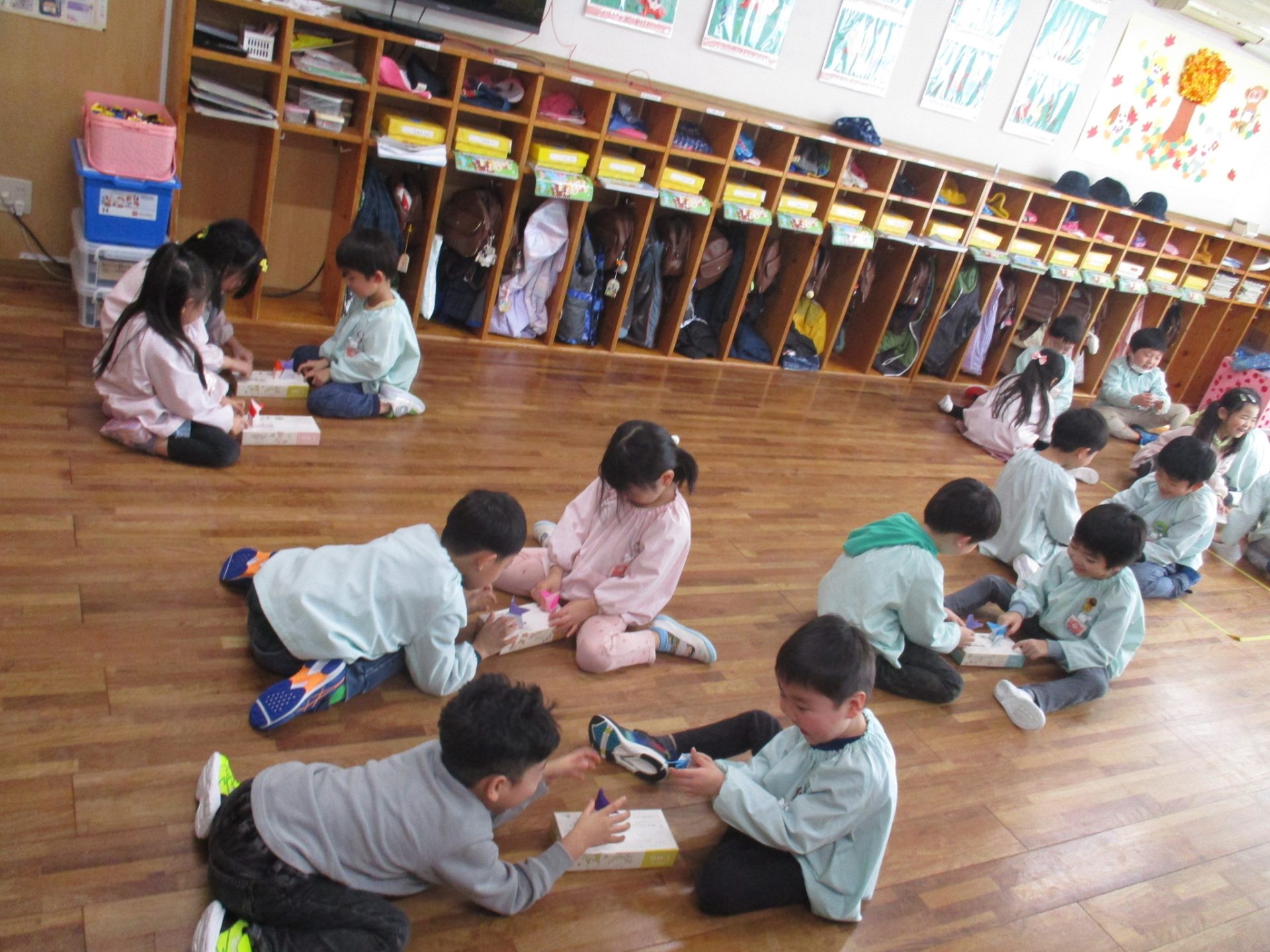 昨日貼り付けた折り紙の周りに絵を描き加えていったり、だるまに表情を描き入れていく作業では、それぞれの個性が良く出ていていましたよ。