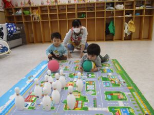 ピンを自分たちで並べて、大きなボールを転がして上手に倒していきましたよ♩