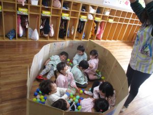 冷蔵庫や掃除機などの家電が描かれたイラストを貼り付けたりしてから、お家の中にカラーボールを入れて、ボールプールの様にして楽しんでいましたよ♩
