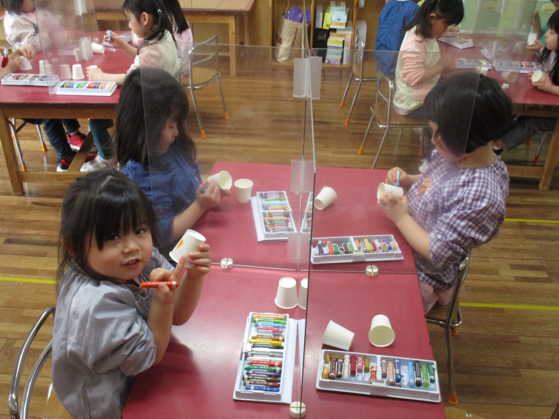 小さいサイズの紙コップを2個ずつ貰って、そこにクレヨンで模様を自由に描いていましたよ!
