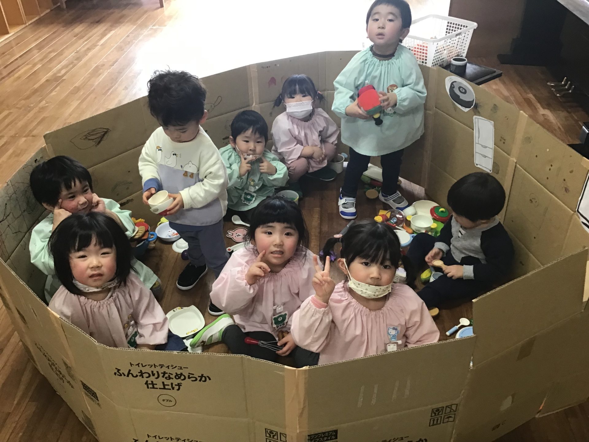 次の日、ふたば組のお友達も一緒に段ボールハウスで遊びました。