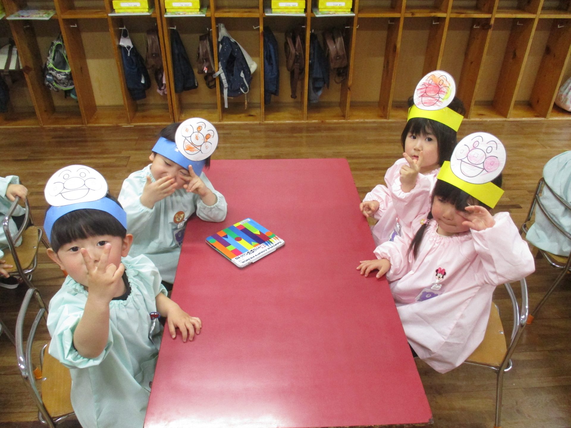 今日はお部屋でアンパンマンのお面作りを行なっていました。