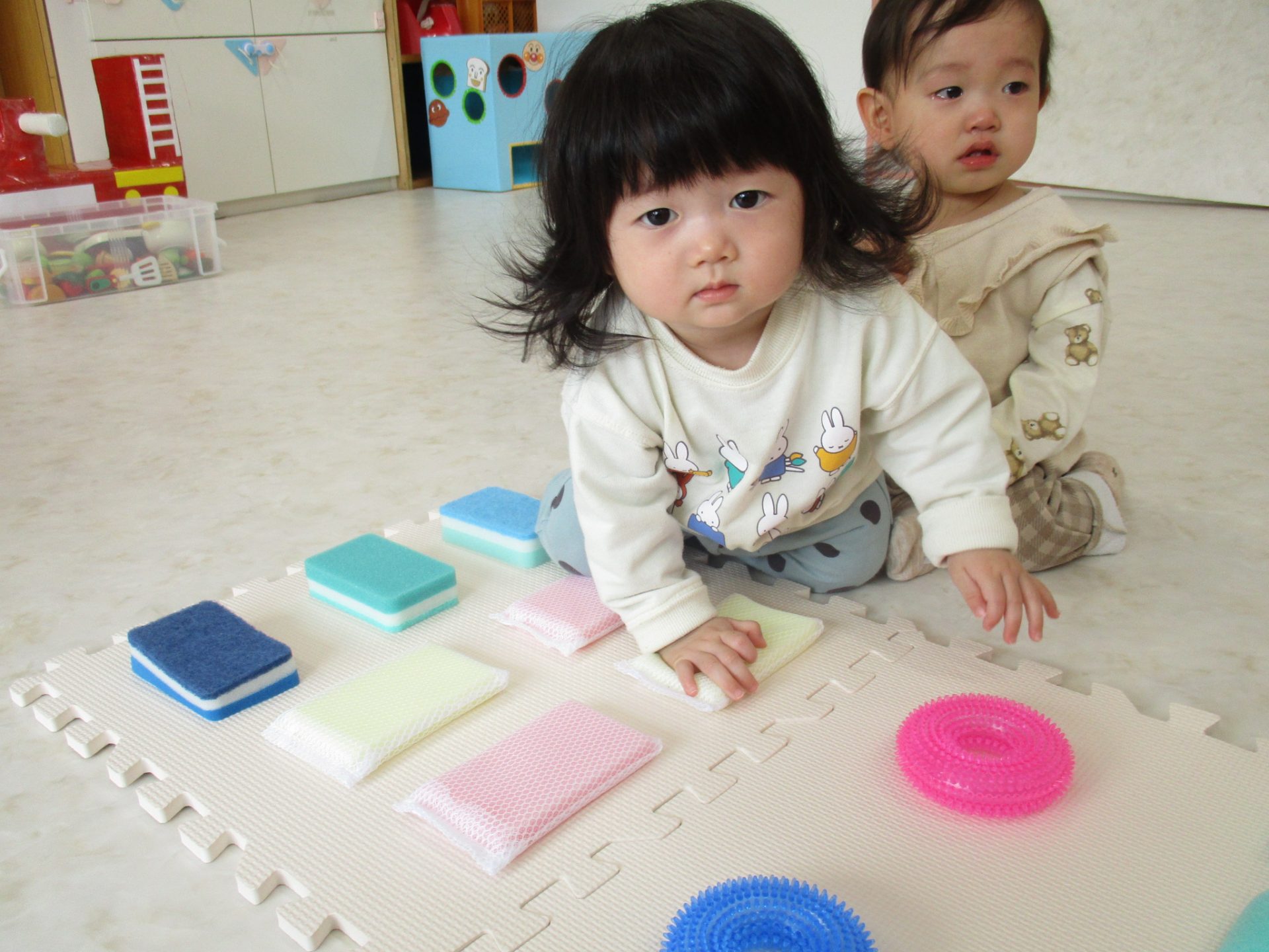 マットにスポンジやCD・ポンポンなどの様々な素材の物を貼り付けた物や段ボールにスポンジを結びつけた手作りの遊具を準備してあげると、1つずつ触ったり引っ張ったりして感触の違いを楽しんでいる様でした♩