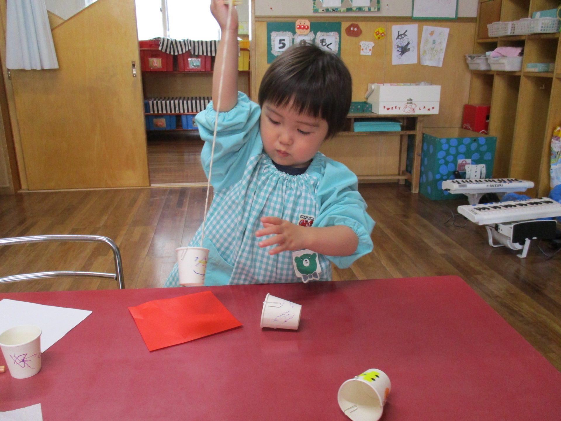 輪ゴムをつけて、もう一つのコップと重ねて飛ぶ様にしてあげると、飛んでいくウサギにびっくりしたり、「もう1回やって」と先生におねだりする様子も見られていました♩