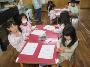 画用紙に緑クレヨンで葉っぱを描いたり、白クレヨンでお花を描いたりして、とても春らしい作品が出来上がっていましたよ♩