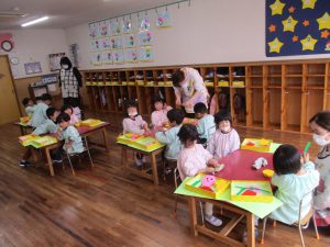 今日も引き続いて雨の天気だったので、各クラス保育室内での活動に取り組んでいました。