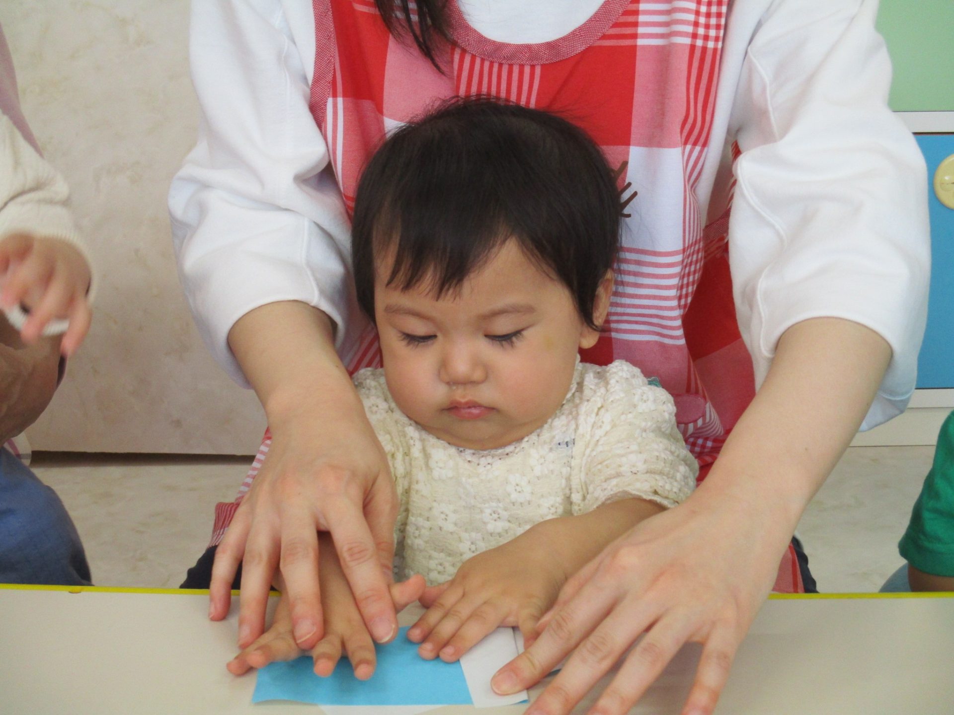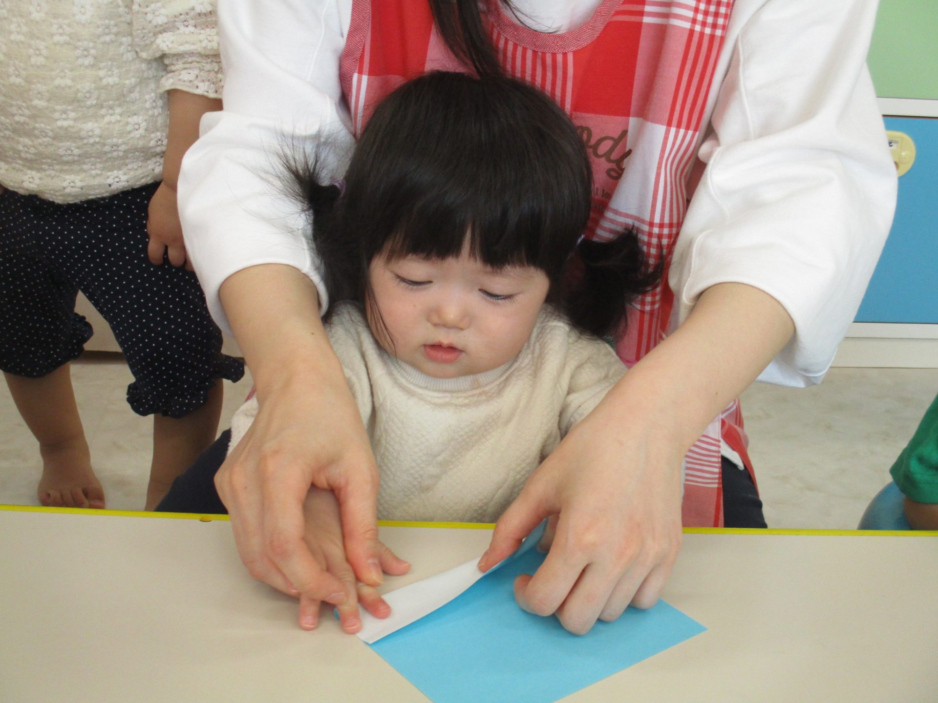 先生が予め作っておいた『鯉のぼり』の折り紙見本を見せると、指差しをしたり声を上げる姿が見られていましたよ♩