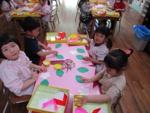 今日は昨日折り紙で作った『イチゴ』を色画用紙に貼っていく活動を行なっていました。