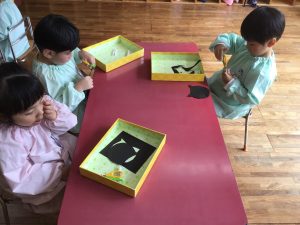 黒い絵の具で手形を取ったので、それを羽の様にするそうで・・・どんな作品が出来上がるか楽しみですね♩