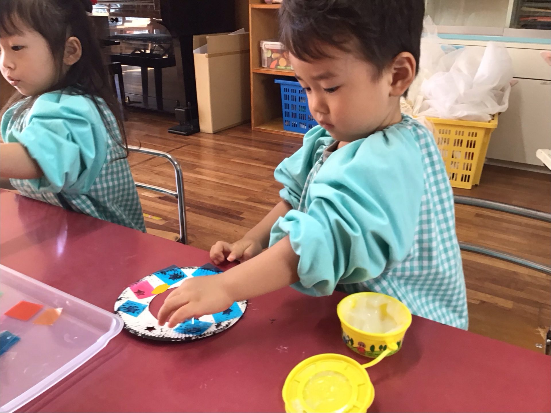 今日は先日絵の具で色塗りをした紙皿を星形にくり抜き、そこにカラーセロファンを貼って色をつけていく活動に取り組んでいました。
