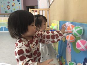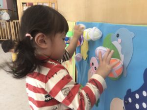今日は動物イラストが貼られているボードを使って、的当てゲームを楽しんでいました。