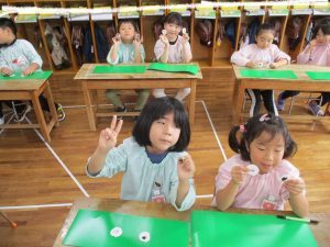 ヤクルトの空容器に折り紙をちぎって貼っていったり、白画用紙に目玉を描き入れていましたよ!