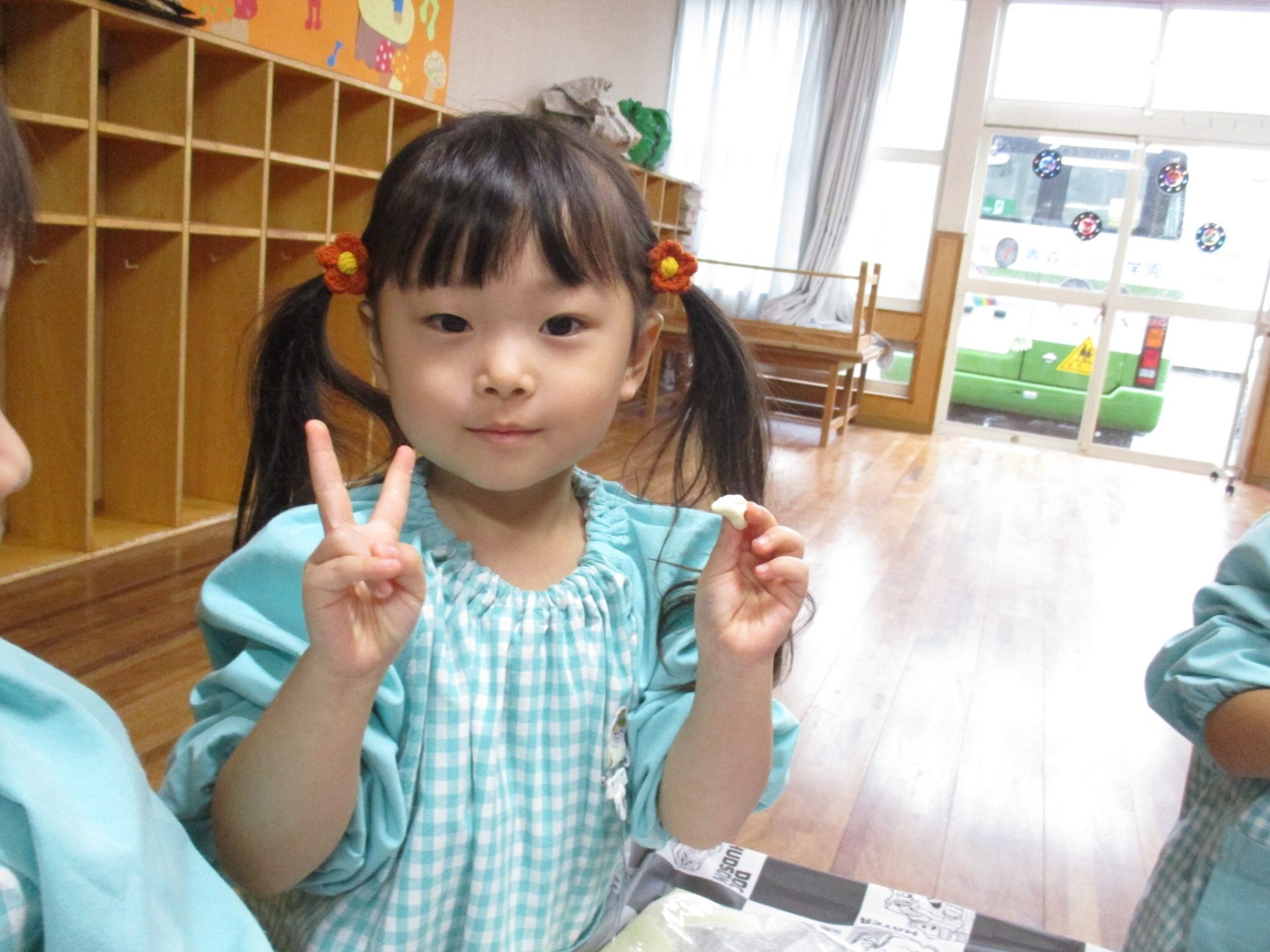 丸めてみたり、細長くして「へびだよ!」と見せてくれたり、手を小麦粉だらけにしながら楽しそうにしていましたよ♩