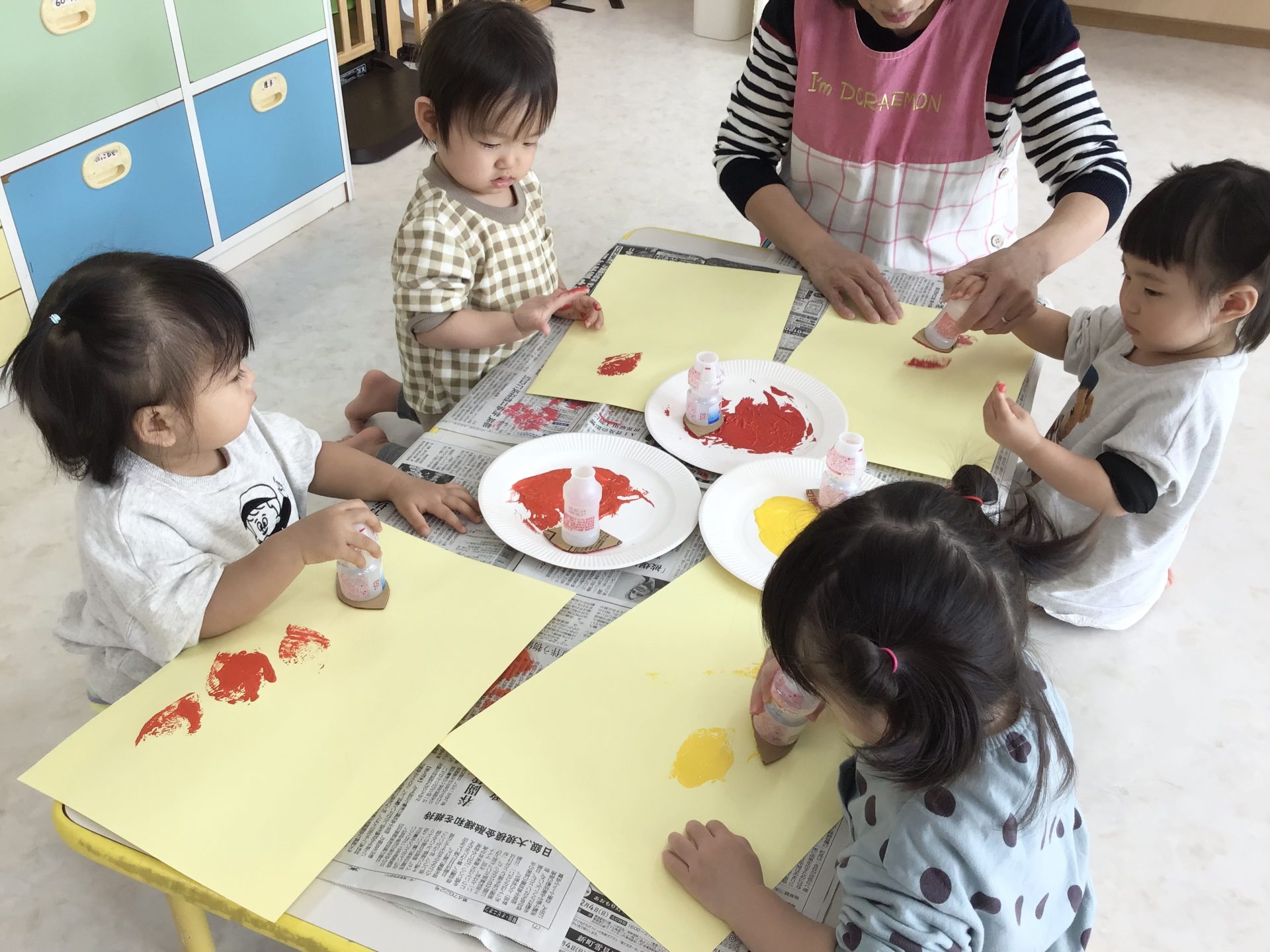 絵の具を付けて画用紙の上に押し当てていくと葉っぱの形がつき、子どもたちも大喜びで何度も繰り返しスタンピングを楽しむ姿が見られていましたよ♩