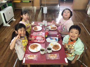 今日の献立はスパゲッティ!口の周りをケチャップだらけにしながら(笑)みんな良く食べていました♩