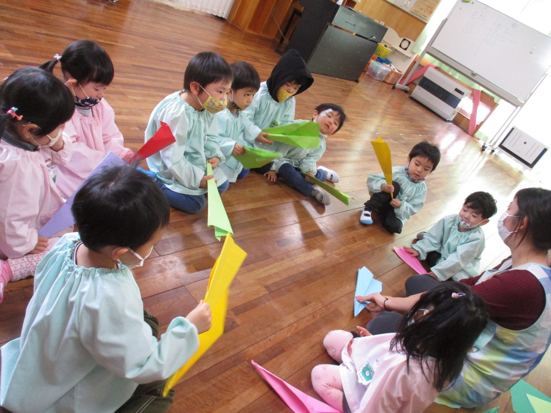 つぼみ組さんは画用紙を使って大きな紙飛行機を作って遊んでいました。一人では難しい作業もありましたが手伝ってもらいながら楽しんで取り組んでいましたよ!