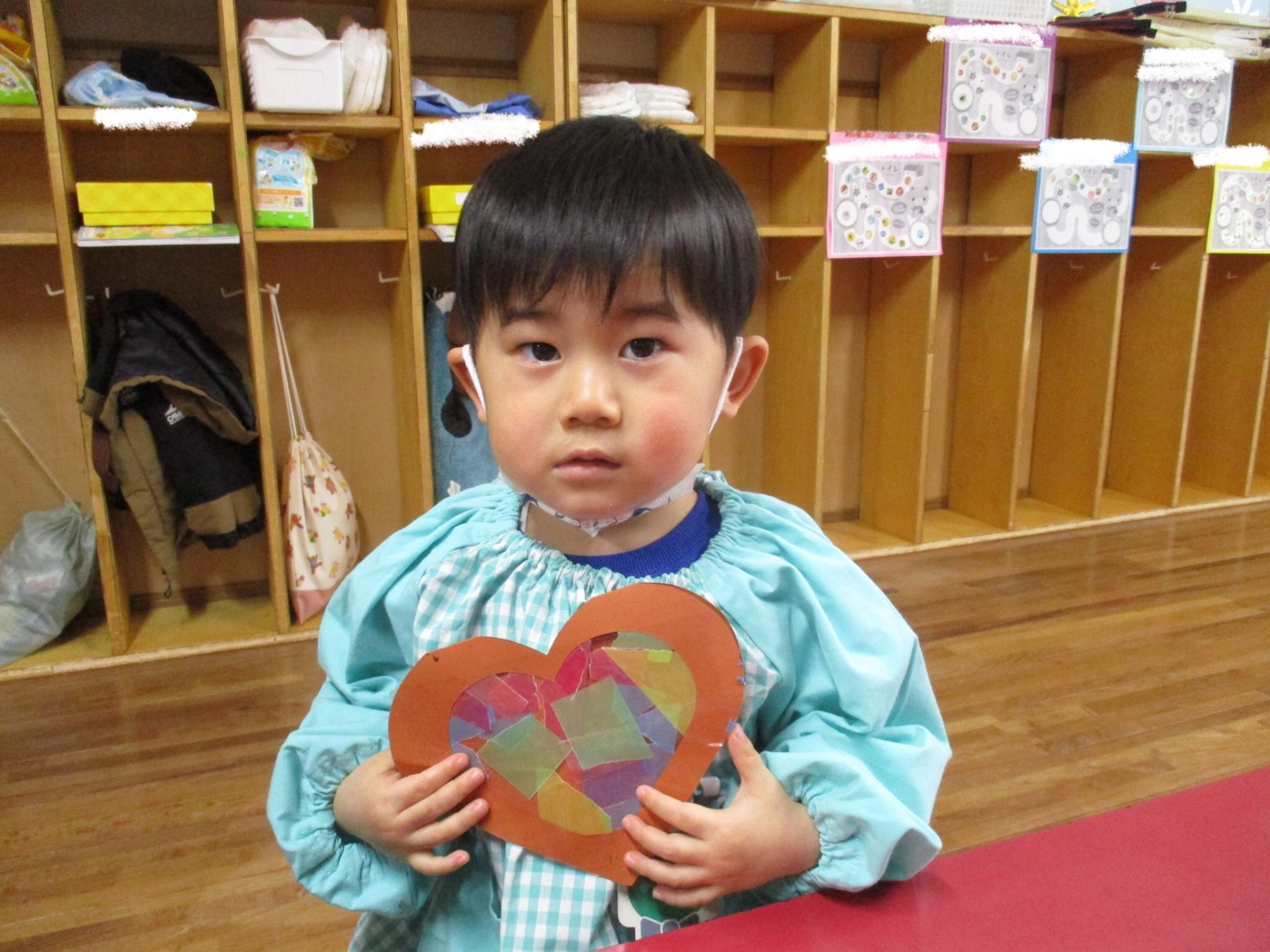 今日はバレンタインという事で、ハート型の色画用紙に動物のイラストが描かれた物を使ってゲーム遊びを楽しんでいました。