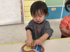 今日はハートの中心がくり抜かれた色画用紙にテープを貼っておき、粘着面に折り紙をちぎって貼っていきました。