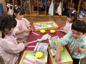きくさんではおひな様・おだいり様の顔のパーツを切り、のりでの組み立て作業を行っていました!