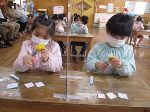 まずはハサミでパーツを切っていく作業でしたが、さすが年長組さん。みんなスムーズに取り組む事ができていましたね。