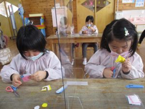 切ったパーツをボンドやのりで貼り付けて行き、『ティッシュ・はんかち』という文字も自分たちで書き入れていくなど、年長さんらしい活動が多かったです。