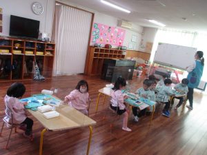 ばら組さんは今日はお勉強の時間になっていました。みんな楽しみながらお勉強をして、正解するたびに「やったー!当たった!」と喜ぶ姿が見られていました!