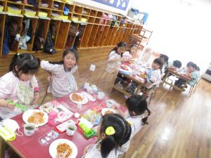 今日は週末という事で、お給食の様子の写真も載せていきます。つぼみ組さんは間に合わず、食べ終えてしまっていたので食後の自由遊びの様子になっています。。