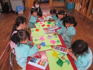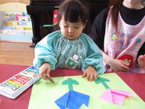 チューリップの周りにクレヨンで自由に絵を描き加えていったのですが、みんな各自の好きな色のクレヨンを手に、楽しそうに描いている姿が見られていましたよ♩