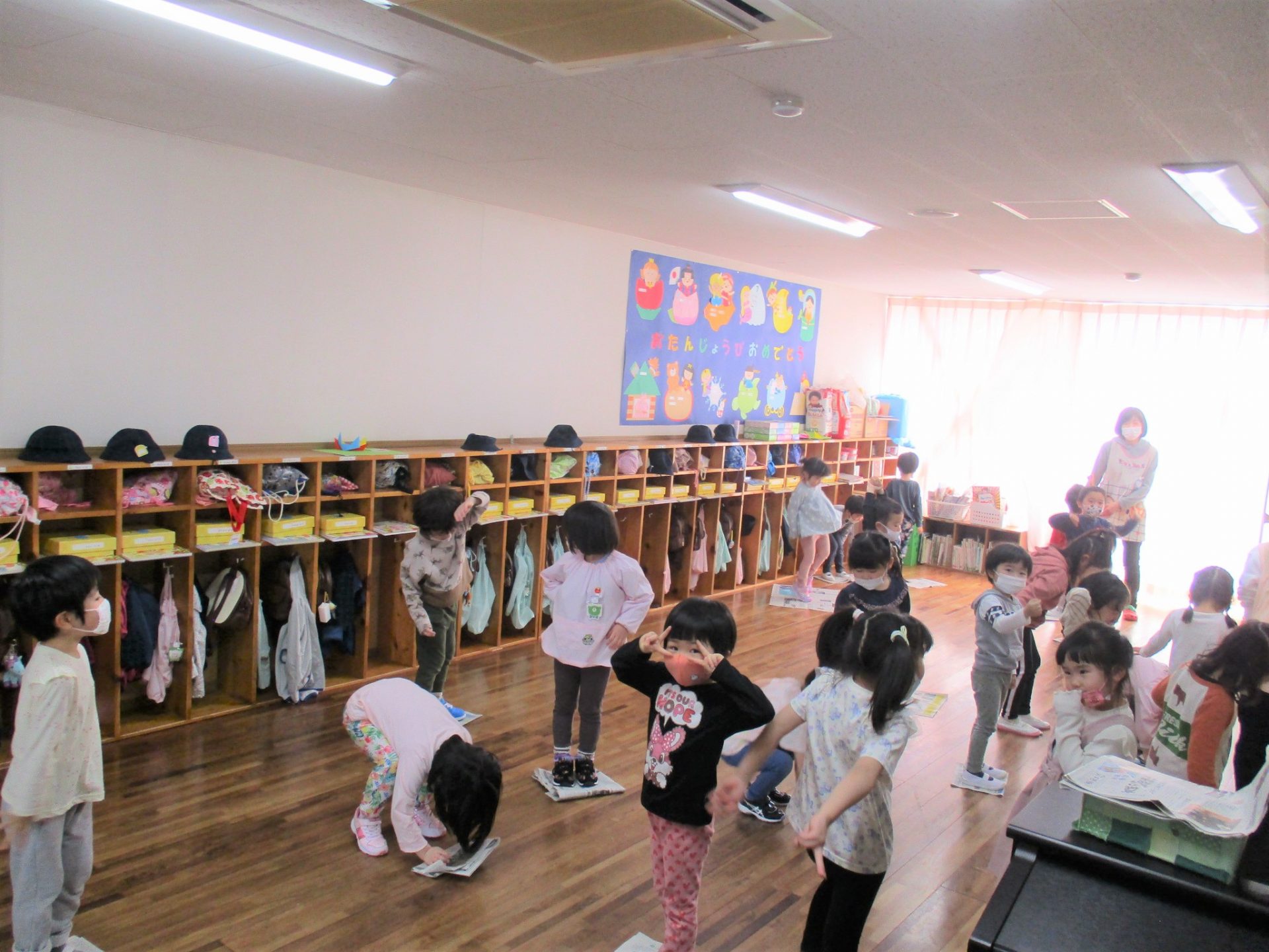 きく組さんは新聞紙を使ってゲーム遊びを行なっていました。先生とのジャンケン勝負では勝敗が決まるたびに一喜一憂する姿が見られて、盛り上がっていましたよ!