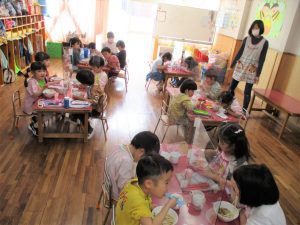 今日の献立はきつねうどん・りんご・カルピスです♪みんなパクパクと良く食べてくれていて、写真の為にお邪魔したら「先生美味しいよ~!!」という声が沢山聞こえてきていました。