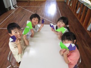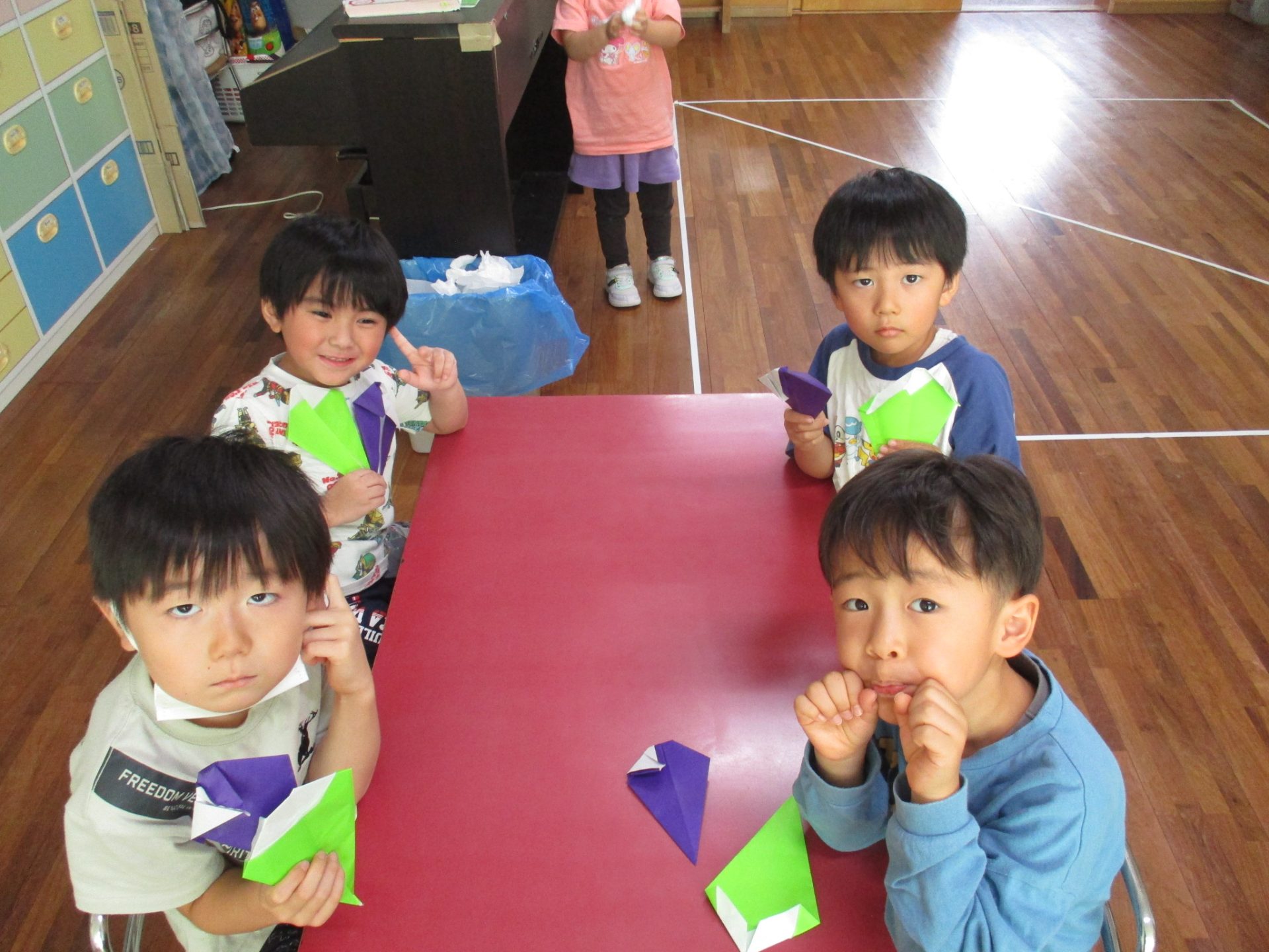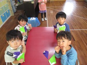 紫・きみどり色の折り紙を受け取り、今日はブドウを作っていましたよ!