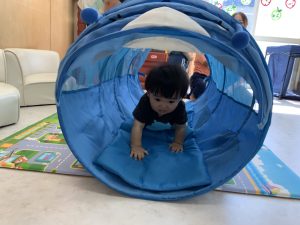 今日はお部屋でトンネルやバランスウェーブの遊具を使って遊んでいました。